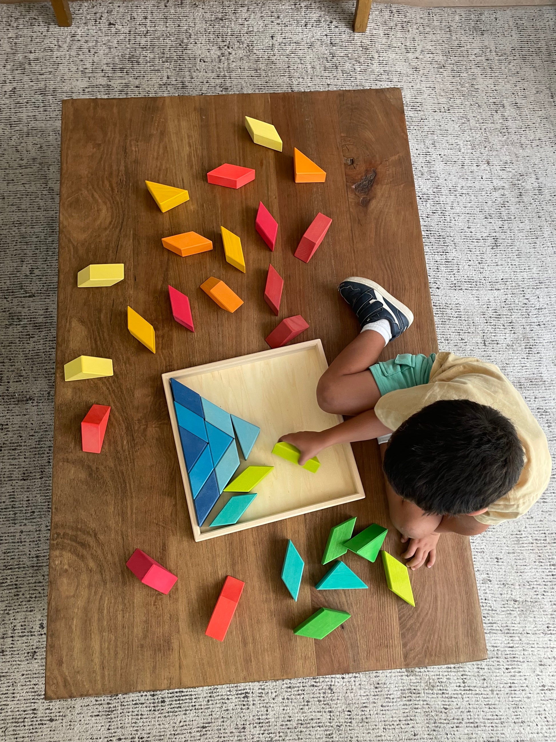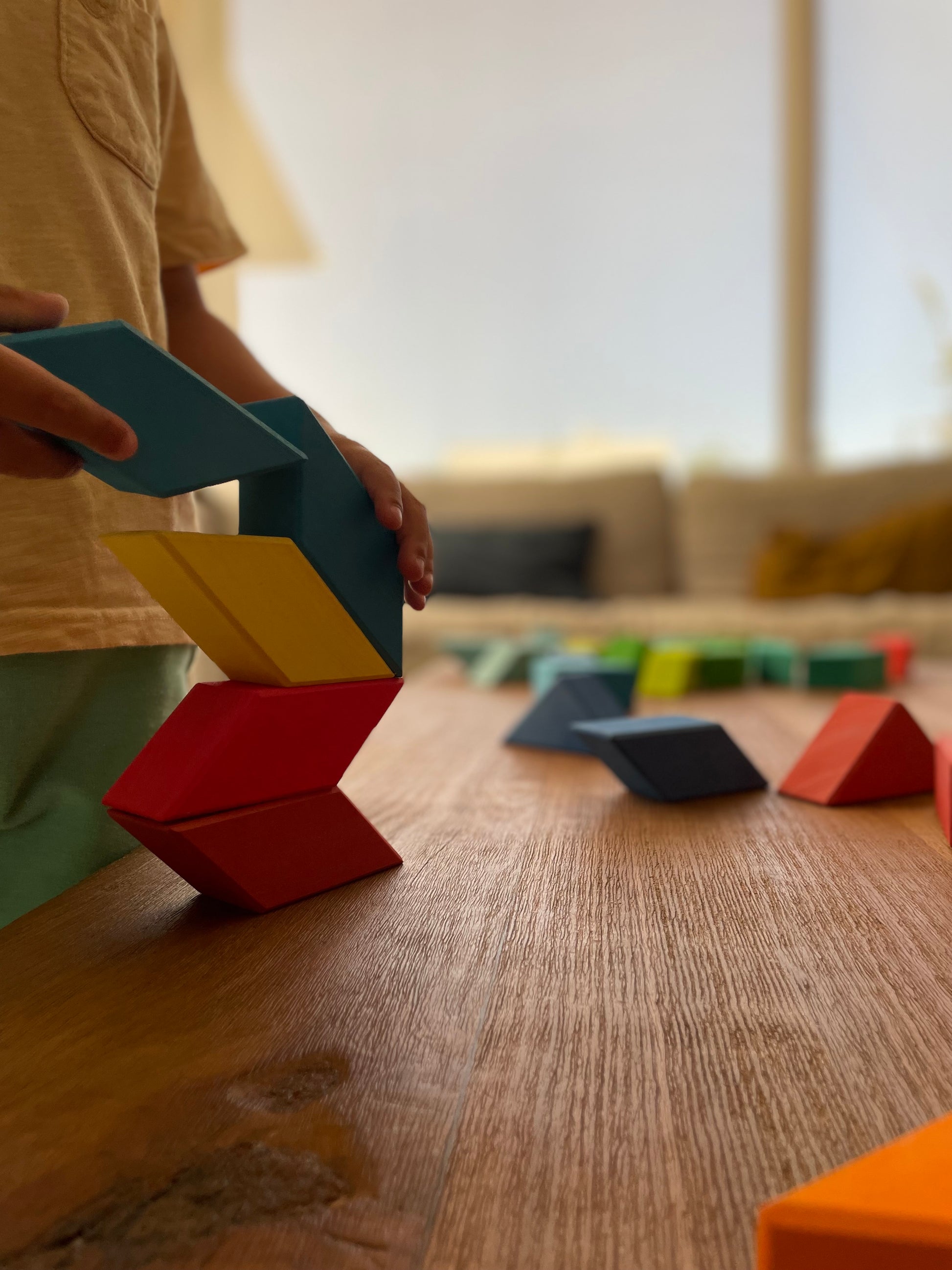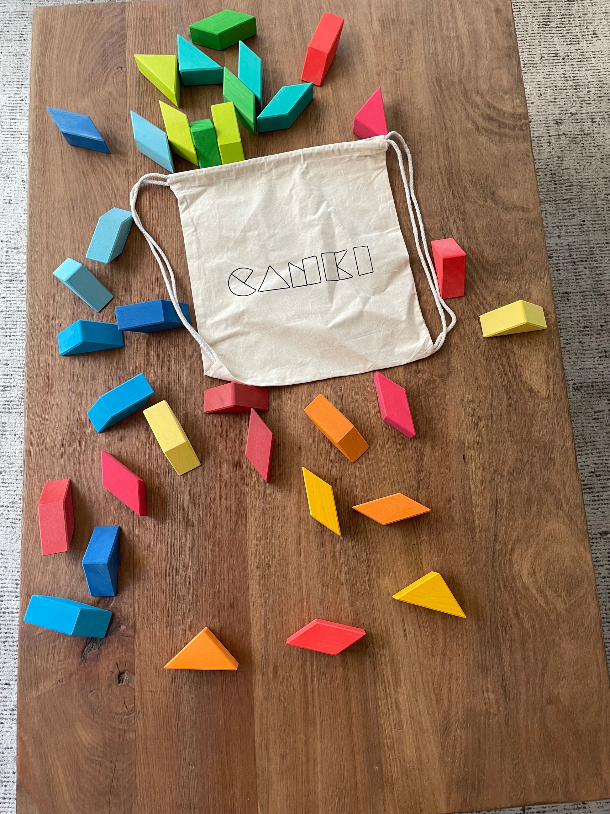 Un clásico de la geometría que aquí se transforma en un juguete abierto y colorido. Con sus piezas, los niños pueden armar las figuras tradicionales del tangrama, inventar siluetas propias o incorporarlas a construcciones más grandes, como techos, pisos, montañas o caminos.