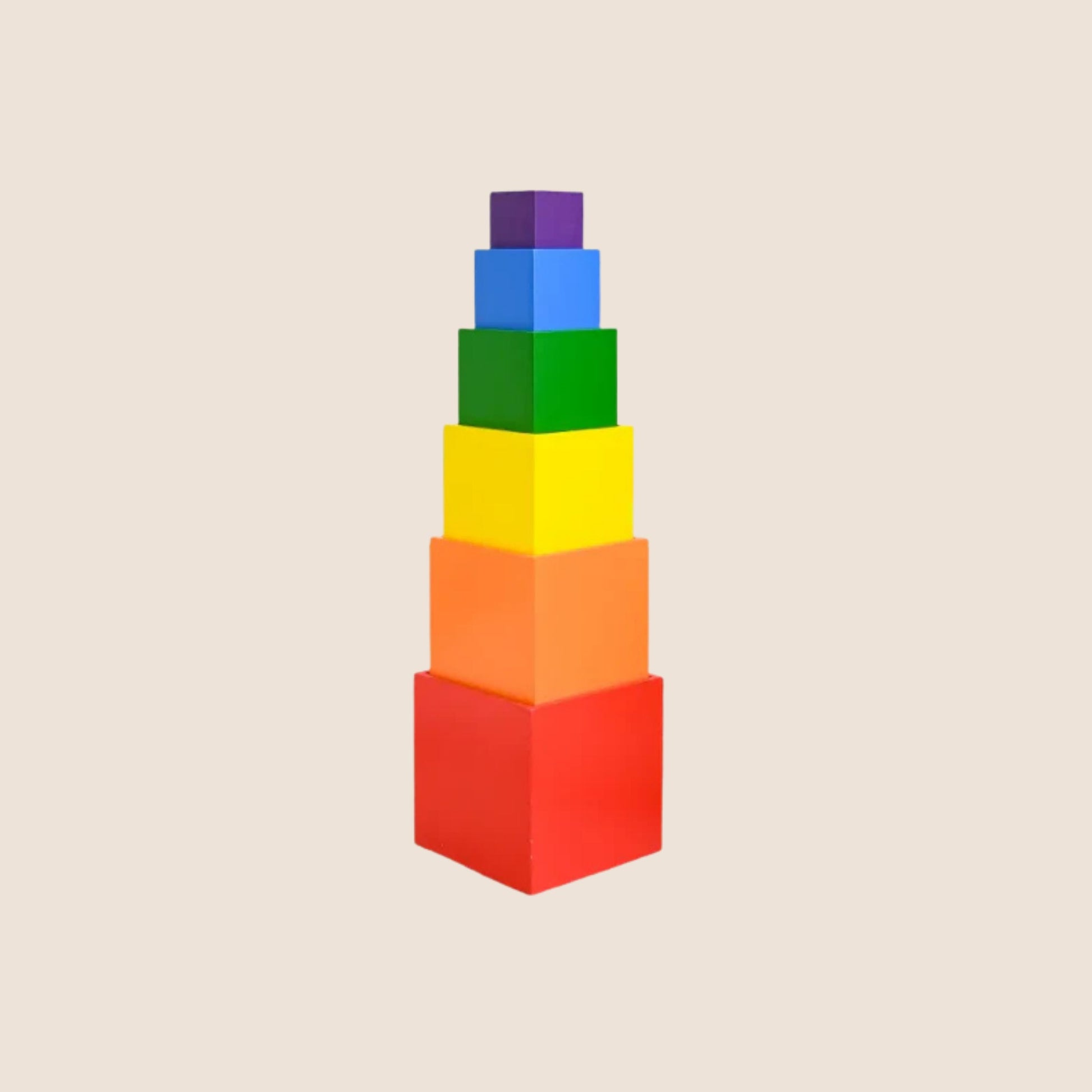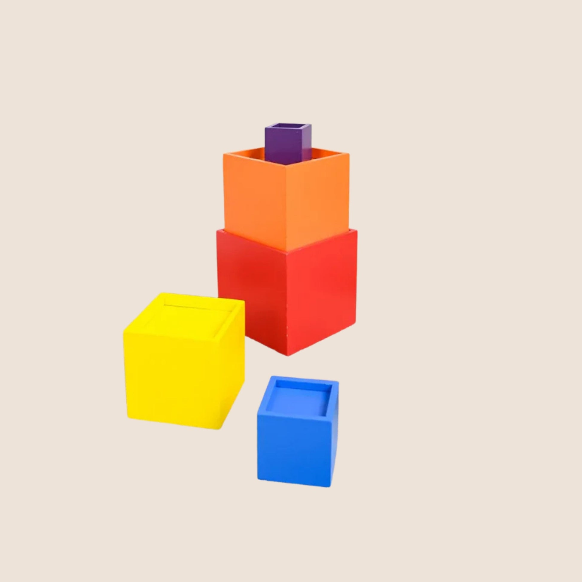 Este set de cajas de colores es mucho más que un juego de apilar. Pueden convertirse en casas para muñecos, túneles para autos, edificios de una ciudad o contenedores para clasificar pequeños tesoros.