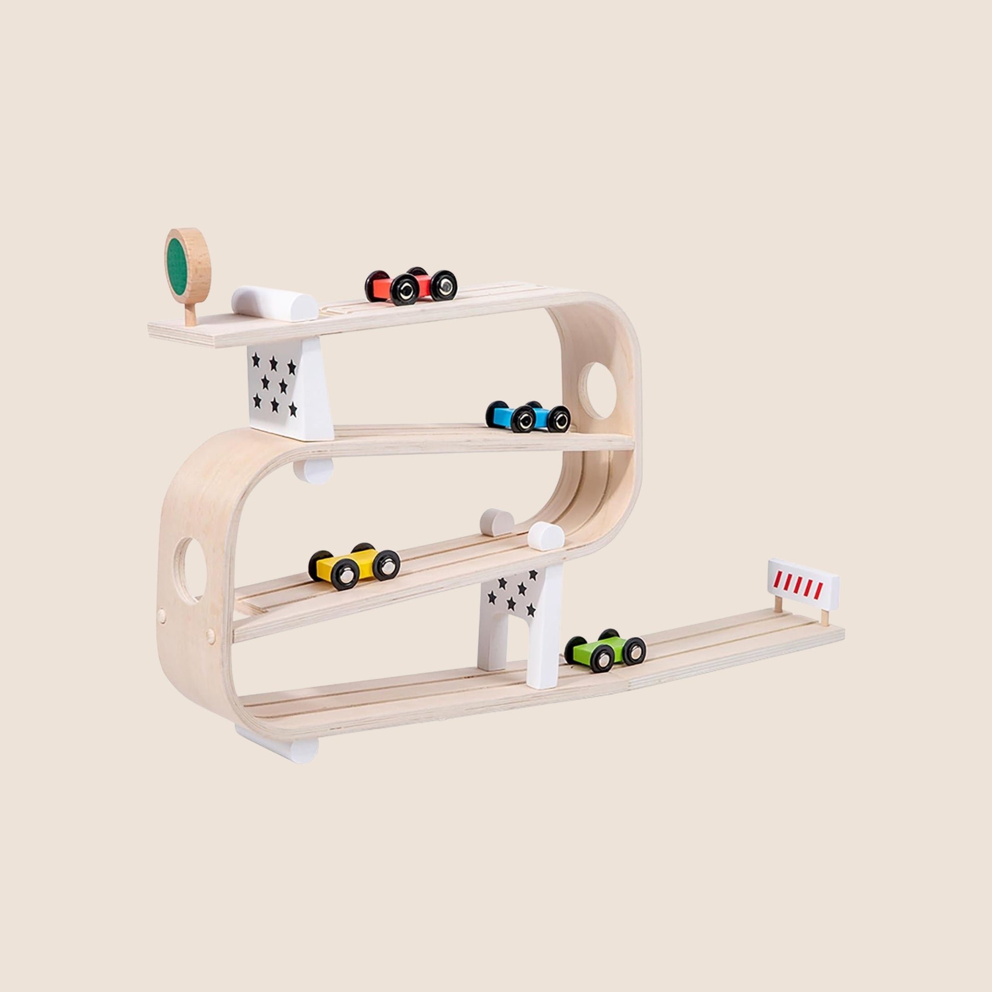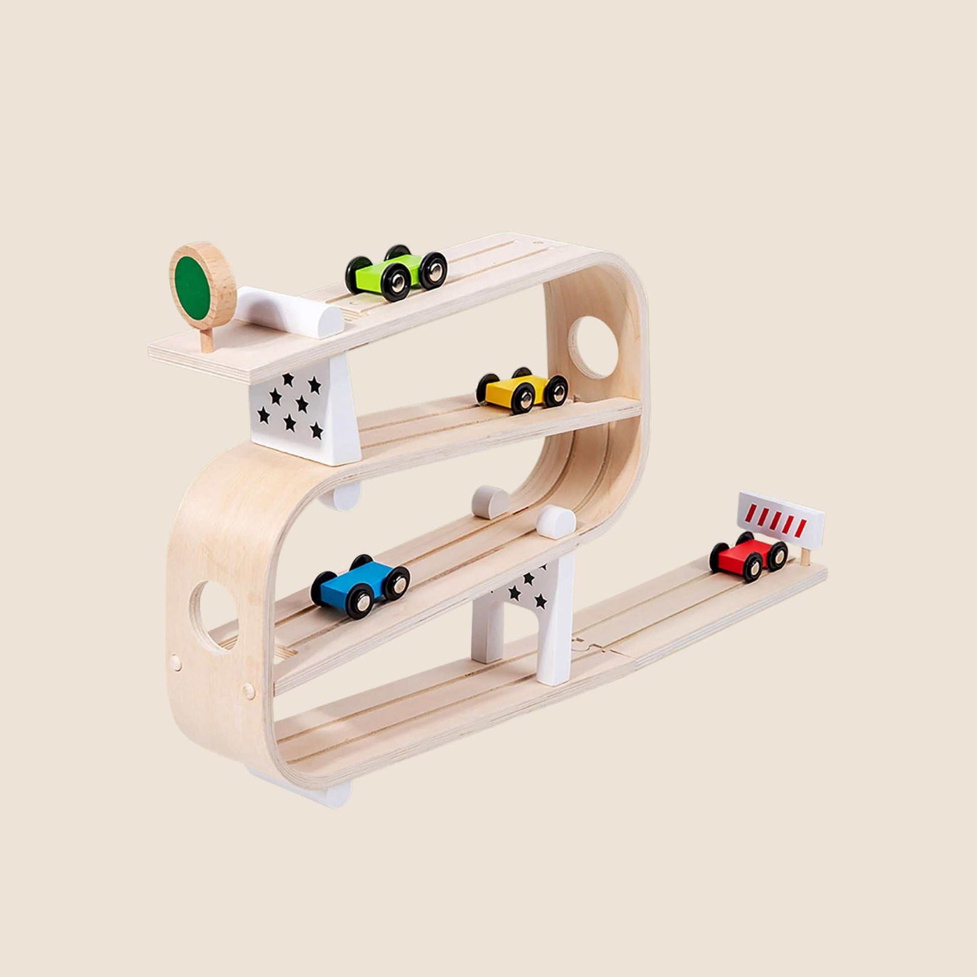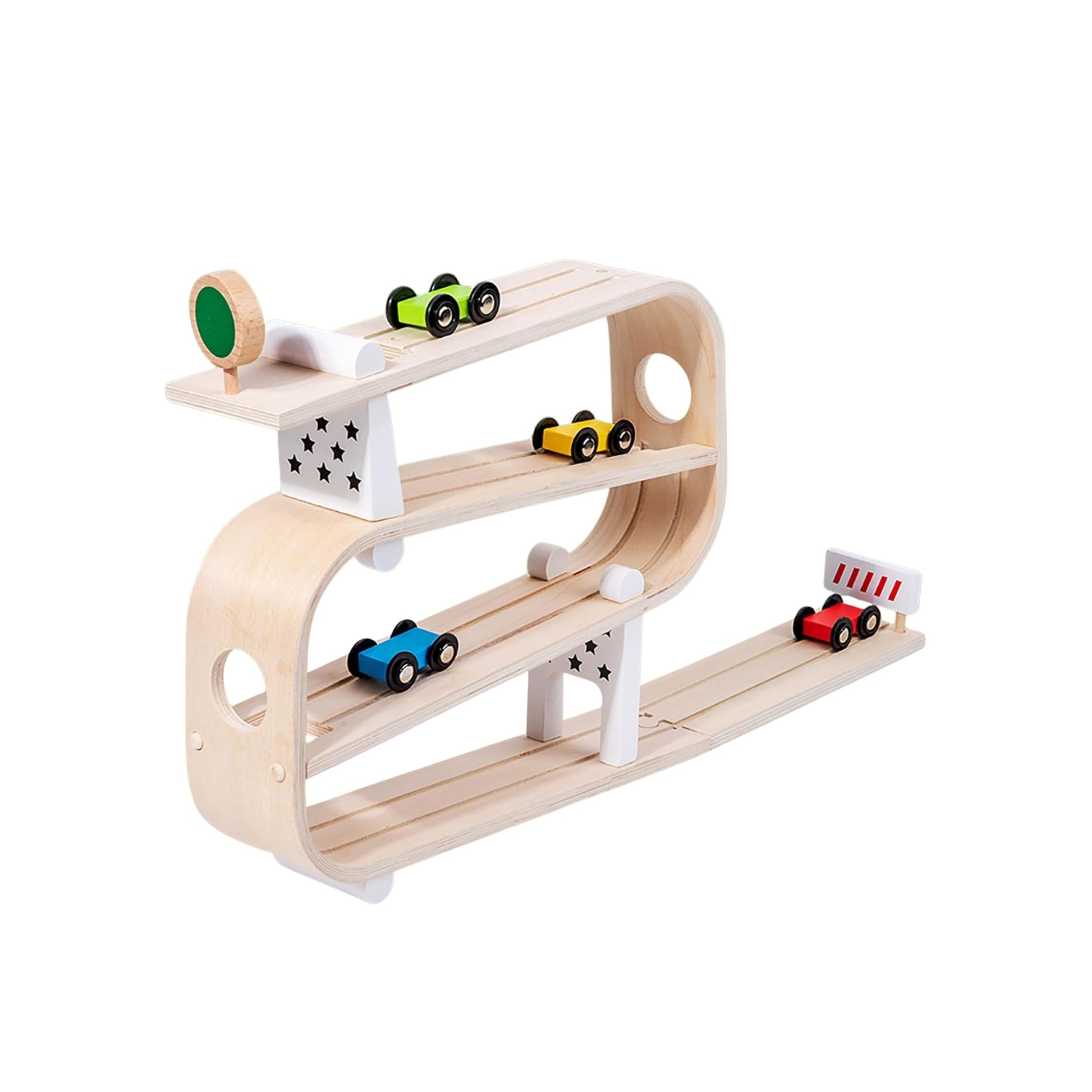 Esta rampa de madera trae consigo horas de diversión en movimiento. Los niños pueden soltar los autos desde lo alto y ver cómo descienden por cada nivel, una y otra vez.
