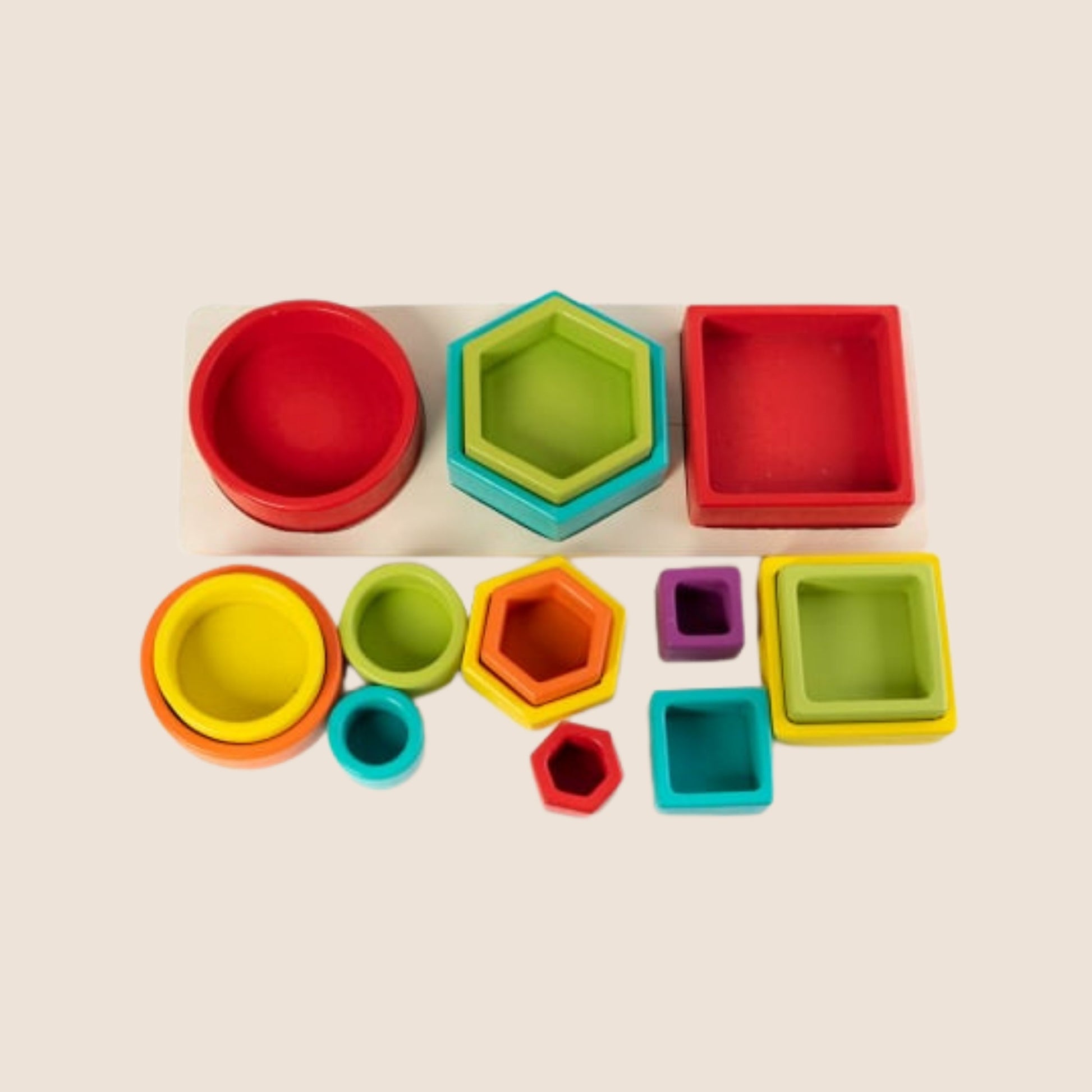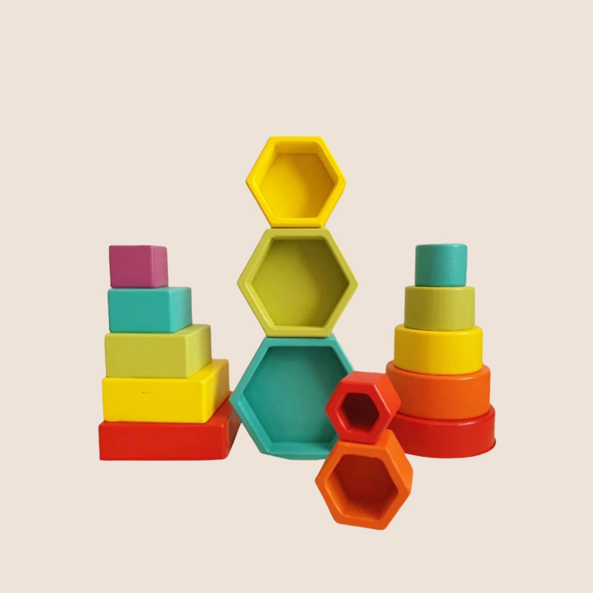 Tres pirámides en colores brillantes que pueden armarse, desarmarse y volver a apilarse de infinitas formas. Los niños pueden experimentar con alturas, simetrías y combinaciones, desarrollando la coordinación y la creatividad en el juego libre.