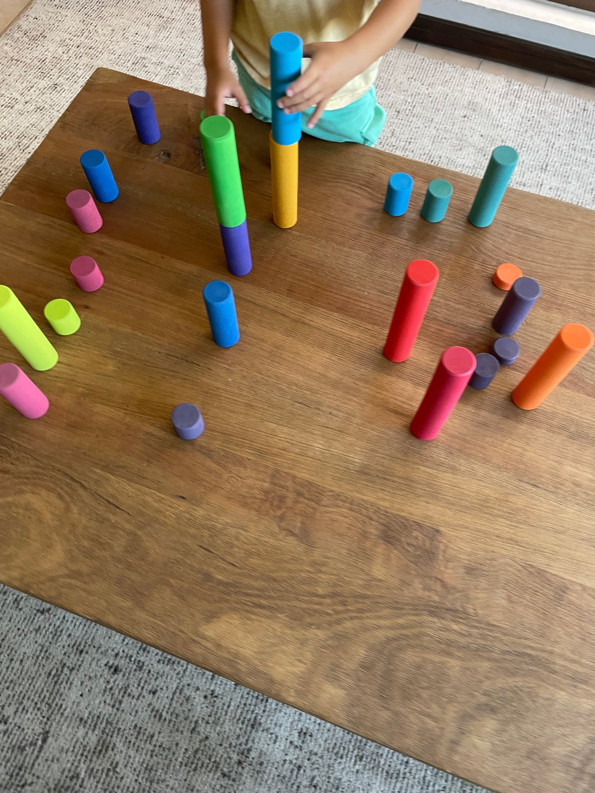Este set incluye rodillos de madera que ruedan en todas direcciones, incorporando el movimiento al juego de construcción. Los niños pueden usarlos para crear caminos dinámicos, bases móviles o integrarlos a construcciones más grandes como palacios, castillos o ciudades completas.